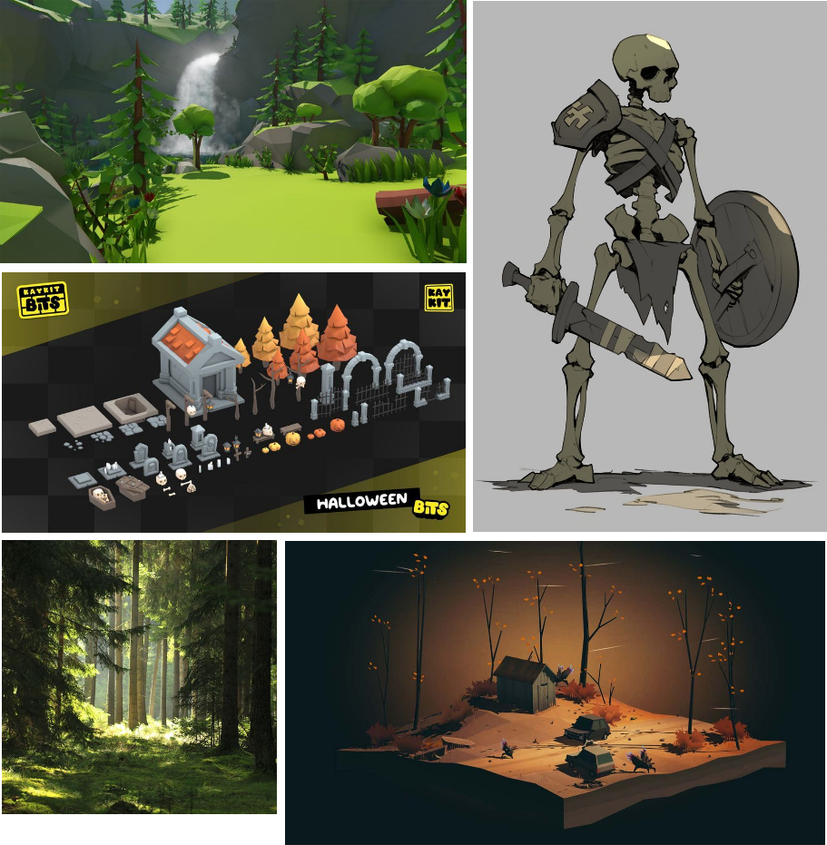 As we were creating our own low poly weapons for this project, a low poly style for the game was decided. With this in mind we wanted to collect the assets for the game first, with those we could decide what kind of game/story we exactly wanted. Before we started the asset search, we knew a forest map would be the most flexible and were thus hoping to find assets to align with a forest pack. We quickly found the Halloween bits pack, then the skeleton pack and a player pack we could use that would fit our theme.